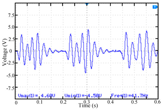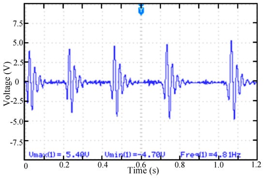 In many cases, the vibration is weak and the direction of vibration is single. The test device is the single dimension vibration test platform as shown in Figure 5a. Under this excitation condition, only the permanent magnets at positions 2 and 3 can repeatedly excite the piezoelectric cantilever beam. The vibration frequency is 2.5 Hz. The measured voltage waveform is shown in Figure 10. In this case, the cantilever has been in the state of repeated excitation and there is a large amplitude vibration when the permanent magnet passing by and there is a low amplitude vibration when there is no permanent magnet passing by.
