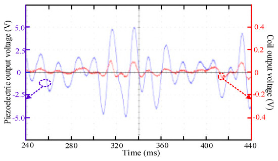 The magnetic field produced by the coil current will react on the permanent magnet of cantilever beam and affect the vibration amplitude of the cantilever beam. It can be seen from Figure 11 that the vibration of the piezoelectric cantilever beam is less affected by the smaller output voltage amplitude of the coil. However, the energy output of the coil is increased. Therefore, the overall energy collection efficiency will be improved by using an efficient low-voltage energy harvesting circuit or using the output energy of the coil as the auxiliary energy for the piezoelectric cantilever energy harvesting.
