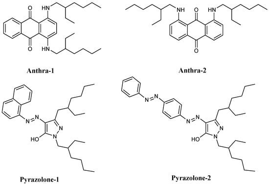 As can be seen in Figure 3, the uv-visible absorption spectra and data of all the dyes were recorded in decane and were found in the range of 416–650 nm, showing color variations from yellow to cyan. For the anthraquinone dyes Anthra-1–2, the maximum wavelength number (λmax) value depended on the position of the alkyl-amino substituented on the anthraquinone ring. When two alkyl-amino groups were substituted on 1,4-sites, the λmax was 650 nm, while the λmax was 545 nm when they were substituted on 1,8-sites. For azo pyrazolone dyes Pyrazolone-1~2, the λmax value depends on the conjugate rings. The λmax of Pyrazolone-1, which is a mono-azo dye with a naphene group, is 416 nm. While Pyrazolone-2 is a bisazo dye with two benzene groups, the size of conjugate rings is a bit larger than Pyrazolone-1, thus the λmax values (420 nm) are a bit longer than for Pyrazolone-1.
