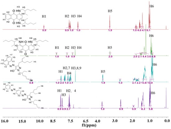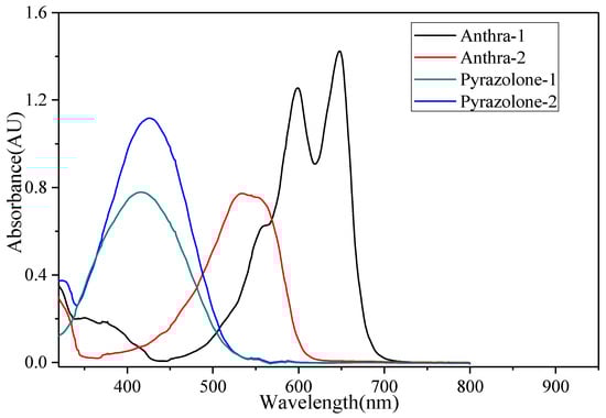 The 1H NMR spectra for the target dyes recorded in CDCl3 are shown in Figure 2. The structures of dyes were confirmed by the presence of four distinct downfield signals characteristic of the aromatic rings. For Anthra-1–2, the structure of the anthraquinone core was confirmed by the presence of four distinct downfield signals (“H1”, “H2”, “H3”, “H4”). The “H1”, “H2”, “H3”, and “H4” protons of Anthra-1–2 exhibited one singlet, two multiplets and one doublet between 10.71 ppm and 6.93 ppm. For the substituents in the N-position, these two dyes displayed one common multiple peak “H5” between 3.22 and 3.14 ppm, corresponding to the methene protons adjacent to the imide group. The “H6” protons appeared as a singlet between 0.88 and 0.83 ppm. For the other pyrazolone dyes Pyrazolone-1–2, the “H1–4” and “H7–9” protons of Pyrazolone-1 exhibited three separate doublets, one triplet, and one multiplet between 8.00 ppm and 7.43 ppm. The “H1”, “H2”, “H3” and “H4” protons of Pyrazolone-2 exhibited three separate doublets and one multiplet between 7.92 ppm and 7.36 ppm. Two dyes: Pyrazolone-1–2, displayed one common multiple peak “H5” between 3.60 and 3.52 ppm corresponding to the methene protons adjacent to the imide group. Moreover, the common multiple peak “H6” of those two dyes represented the protons on the methyl group, and the “H6” protons existed between 0.78 and 0.92 equivalent to the twelve protons which were obtained. The chemical values confirmed the structural correctness of the four dyes.