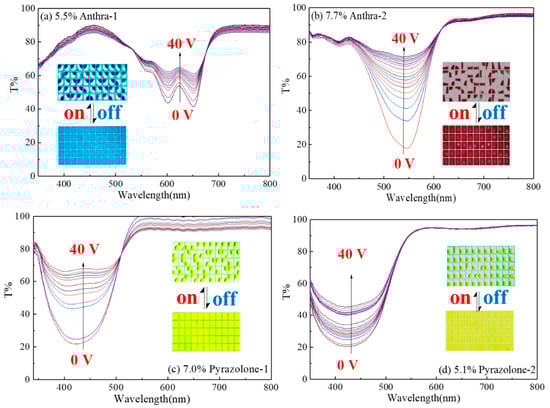 Transmission spectra of EFD display formulated by four formulated dyes under different voltages. (Insert: micron photos of pixels filled with different oils). (a) 5.5% Anthra-1, (b) 7.7% Anthra-2.