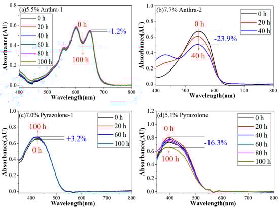 The change of absorbance curves under different irradiation time is shown in Figure 5. The decrease of dye absorbance after a period of irradiation test depends on the degree of dye degradation. Generally, we can see that dye degradation of Anthra-2 and Pyrazolone-2 are higher than Anthra-1 and Pyrazolone-1. After 100h irradiation, only 1.2% of Anthra-1 dyes were decomposed. The good photo-stability of Anthra-1 was attributed to the substitution of –NH at 1,4-sites of anthrquinone structure, which could form two six-membered rings with two carbonyl groups. This special structure could strengthen the electron delocalization and decrease the electron density of potentially destabilizing groups, such as C–N and C–O bonds. In contrast, 23.9% of Anthra-2 decomposed after only 40 h of irradiation. The structure of Anthra-2 is a 1,8- sites of anthrquinone, while only one six-membered ring could be formed at the 1-site. As a result, the other substitution of –NH at the 8-site could not be stabilized and was prone to decomposing under irradiation. The initial anthraquinone dyes underwent a hydroxylation of the alkyl carbon atom adjacent to the left hand nitrogen atom. This resulted in a photo-bleached molecule with the original alkly group of the left hand alkl amine now substituted with the group –CHO [].
