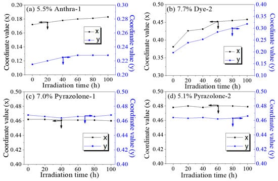 Photo-stability test results of four formulated dyes. (Irradiation condition: 0.55 W/m2 (340 nm); Temperature 45 °C). (a) 5.5% Anthra-1, (b) 7.7% Anthra-2, (c) 7.0% Pyrazolone-1, (d) 5.1% Pyrazolone.
