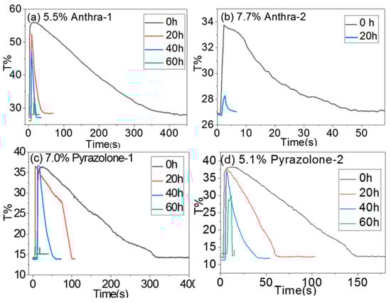 Backflow properties of EFD devices with dyes under different irradiation times. (Irradiation condition: 0.55 W/m2 (340 nm); Temperature 45 °C). (a) 5.5% Anthra-1, (b) 7.7% Anthra-2, (c) 7.0% Pyrazolone-1, (d) 5.1% Pyrazolone-2.