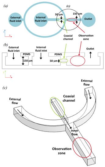 Figure 1. Design of the coaxial flow focusing microfluidic device: (a) Representation of a general (x,z)-plane view of the design; (b) longitudinal section of the device (y,z). The coaxial microchannel is circled in green, the observation zone, where the inner flow is formed, is marked in red; (c) A 3D amplification of the junction where the external flow and inner flow are combined (marked in black in Figure 1a). The coaxial inner flow is represented with a green cylinder. The diagrams are not to scale.