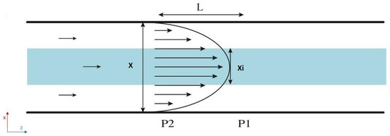 Figure 3. Representation of the Poiseuille velocity profile of our microfluidic system in the (x,z)-plane. The inner flow is represented in blue and the outer flow in white. A single parabolic profile is the result of the miscibility of the fluids. As consequence, the pressure drop from point P2 to P1 of the total flow (inner and outer flow) and the pressure drop in the inner flow from P2 to P1 are the same.