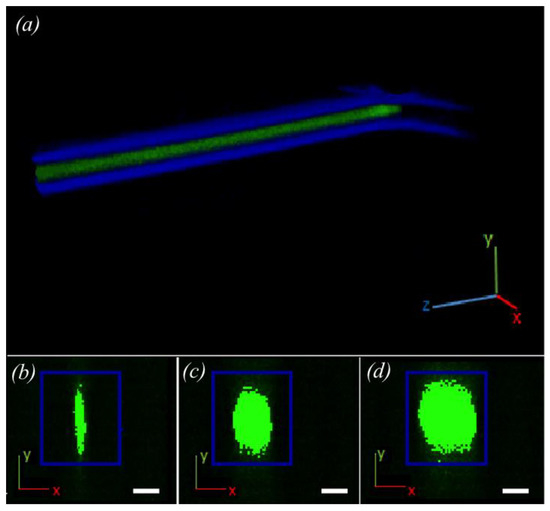 Figure 4. Top: (a) an example of 3D reconstruction with ImageJ software from the confocal microscope images. The blue feature corresponds to the walls of the microchannel where the coaxial inner flow (Qint) is formed, which is represented in green. Bottom: (bd) There are three different examples of reconstructed cross sections (x,y-plane) of the inner flow at different flow ratios (b: 5 mL/min, c: 30 mL/min, d: 75 mL/min). Scale bar: 50 μm.