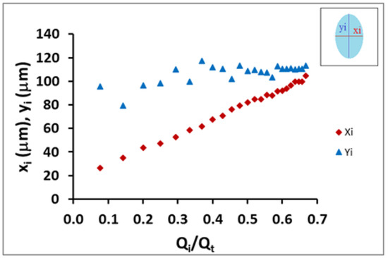 In Figure 5, we show the behavior of the minor axis of the coaxial ellipse jet (xi) and major axis (yi) versus the flow rate ratio. From the data obtained, the difference in changing inner flow cross-section shape could be quantitatively observed. While the minor-diameter (xi) of the initial elliptical cross-section shape increases rapidly, the major-diameter (yi) showed a slower increase; however, this was significant and could not be considered to be constant. Moreover, both diameters were mathematically related to each other and the flow rate ratio. Therefore, the mathematical model developed in the previous section allowed us to better characterize the geometrical shape of the coaxial inner flow (Equation (3)).