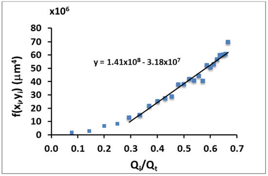 Figure 6. Plot of function f(xi, yi) defined in Equation (3) for different values of Qi/Qt. The values of xi and yi are experimental measurements. The continuous line is the regression line of the data with a slope mexp = 1.41 × 108 μm4 with an R2 value of 9.55. The theoretical model predicted a slope of mth = 3.64 × 108 μm4.