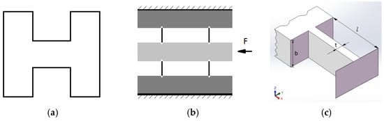 The mechanical model for the rectangular section of the flexible hinge is shown in Figure 1c. Since the movement causes the flexible hinge to elastically deform, the stiffness in each direction must be calculated. According to the equations of material mechanics [27], the stiffness and torsional stiffness motion in the direction x are: