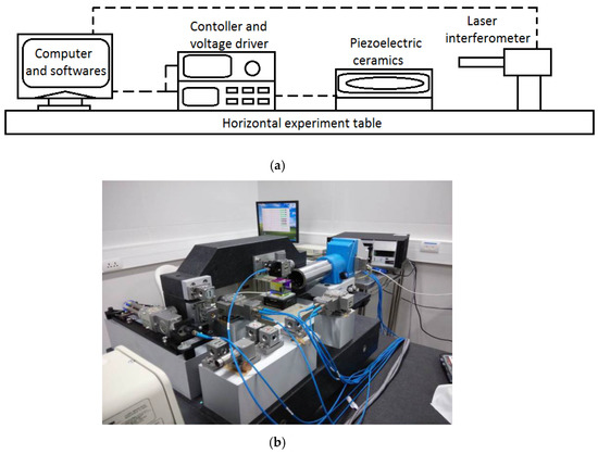 The experimental system was built using a laser interferometer, nanopositioning platform, reflection mirror, controller, and computer software, as shown in Figure 3a. The laser interferometer used is the Renishaw XL-80 series achieves an accuracy of ± 0.5 ppm. The selected driver was the HVA-150D.A3 instrument from Harbin Xinmingtian Company, whose voltage input variable range is 0 V-150 V. Figure 3b shows the actual experimental system.