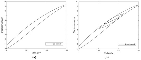 The expected voltage displacement curves should be linear. Analysis of the experimental data established the nonlinearity of the experimental curve. The voltage displacement curve at the single-ring linear voltage has a hysteresis characteristic. The voltage displacement curve at the reciprocating linear voltage has the same hysteresis characteristics as the single-ring voltage’s, while the reciprocating voltage’s hysteresis loop conforms to the Madelung principle [30]. Therefore, in order to solve the hysteresis characteristics of the piezoelectric ceramic under single-ring linear voltage and reciprocating linear voltage, an effective compensation method is needed.