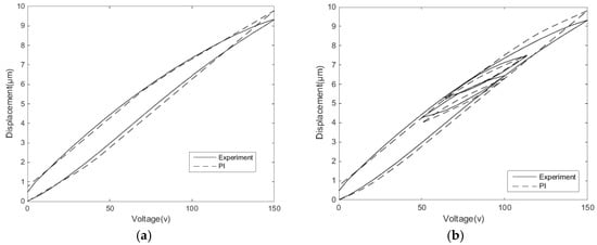 Figure 7 shows the modelling of the PI model to display the single-ring linear voltage hysteresis characteristic and reciprocating linear voltage hysteresis characteristic of the second section. The modeling results show that the classical PI model describes the hysteresis characteristics well under single-ring linear voltage, but the accuracy under the reciprocating linear voltage is comparatively poor. The main reason is that the hysteresis characteristics of the reciprocating linear voltage are more complicated, and the hysteresis rates between the inner loop and the outer loop are different. Meanwhile, the classical PI model cannot describe the Madelung principle of the hysteresis inner loops.