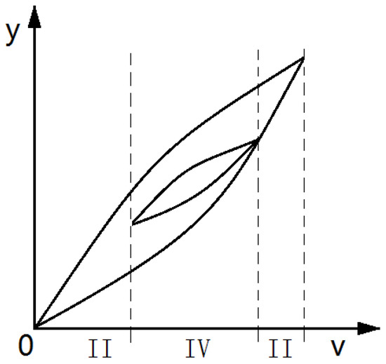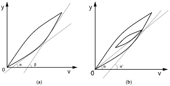 In order to further improve the description accuracy of hysteresis characteristics, the hysteresis rates must be studied in depth. The hysteresis rates corresponding to the voltage–displacement characteristic curve are the weighted superposition of the Play operators in the PI model at that point. The weight of the th operator depends on the angle between the tangent line of the hysteresis loop at that point and the v-axis. The angle , as shown in Figure 8a, is not exactly the same in each tangent on the hysteresis loop. The hysteresis rate of the reciprocating linear voltage is even more complicated. As shown in Figure 8b, the tangent at approximately similar positions of the inner loop and outer loop tends to have different hysteresis rates.