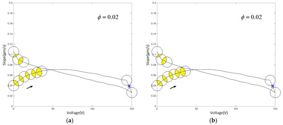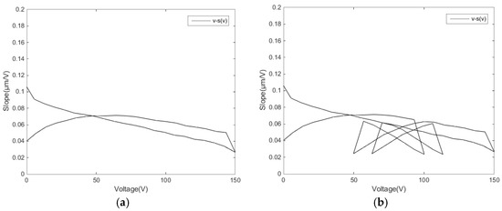 The voltage–slope diagram describes the characteristics of the hysteresis rate at any voltage. The different input linear voltage leads to varied hysteresis rate tangent regulation. Figure 10 is the diagram of experimental data for the single-ring linear voltage and the reciprocating linear voltage, respectively. Both groups of data evidently show segmentation in the diagram.