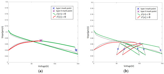 The voltage–slope diagram embodies the change of the hysteresis rate. For reciprocating hysteresis, plenty of turning points appear at the critical edge of boost phases and back phases. Compared with the hysteresis under single-ring linear voltage [24], reasonable identification I required for all mark points in order to fulfill the demands of complex hysteresis segmentation. Meanwhile, data with continuous and similar variation laws should be modeled in the same segment. Therefore, a mark-segmented PI (MSPI) model is proposed.