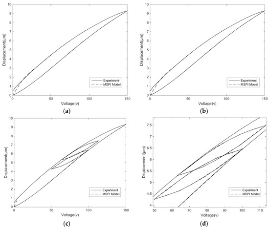Figure 19 shows the hysteresis characteristics of the experimental measurements and the modeling comparison between the classical PI model and MSPI model. The MSPI model has a higher description accuracy, which repeatedly proves that the MSPI model can be applied to different hysteresis characteristics.