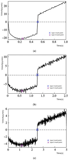 Although the output speeds are different at different frequencies and the maximum displacement time is shortened as the frequency increases, the same variation characteristics are maintained. If the speed is taken as an absolute value, the speed–time diagrams can find a similar relationship as with the diagram. Both the type I mark points and the type II mark points have been identified on the map in the same color as the diagram.