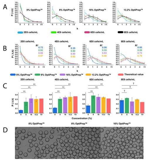 Figure 3B shows that the addition of 13.2% OptiPrep™ is optimal to predict the ratio of droplets containing different numbers of cells, as the experimental curves of the cell-laden droplet ratio under different conditions fit well to the theoretical values.