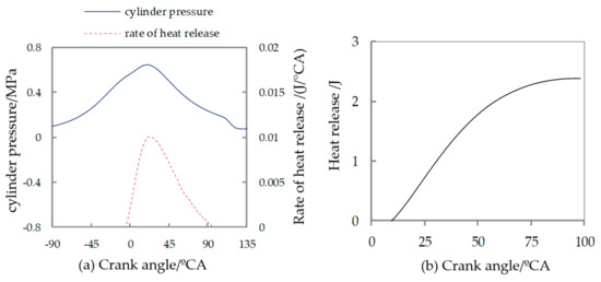 Figure 2 shows the characteristic curve of the cylinder pressure and the combustion heat release rate in a micro piston internal combustion engine under the working condition of a full load at 6000 r/min. Figure 2a shows the instantaneous heat release curve. Figure 2b shows the cumulative heat release curve. The fuel is pure methanol; its lower calorfic value is 21.12 MJ/kg with a density of 0.81 g/cm3. It can be seen from Figure 2 that the cylinder pressure of the platinum wire glow ignition micro-piston internal combustion engine was relatively low when taking pure methanol as fuel, and the maximum combustion pressure Pmax was only 0.65 MPa. The lower combustion pressure and the delays of corresponding crank angle will reduce the expansion ratio of the engine and reduce the thermal efficiency of the cycle. The mean indicated pressure Pmi (indicated work/swept volume) at the test was at a low level, and the Pmi value obtained from the Indicator diagram was only 0.137 MPa.