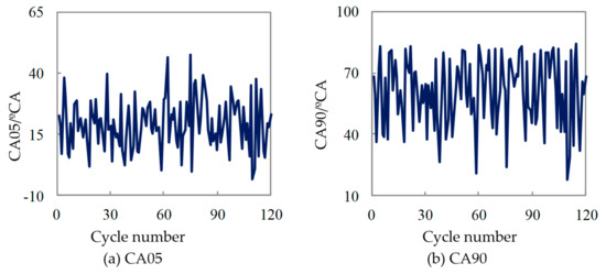 Figure 4 was the variations in the crank angle corresponding to the cumulative heat release 5% and 90% (CA05 and CA90) for the 120 continuous test cycles under the working condition of full load of 6000 r/min. It can be seen from the Figure that the starting point of combustion (CA05) varies greatly. The variation ranges from 5 °CA before top dead center (BTDC) to 40 °CA ATDC, and its variation range was close to 50 °CA. The changes in the ignition time will lead to a higher cyclic variation; as the CA05 in the Figure 4 was greatly delayed, the corresponding Pmi value in Figure 3 declines more obviously. This shows that the instability of the combustion starting point was the main reason for the high cyclic variation in the combustion process in the micro-space.