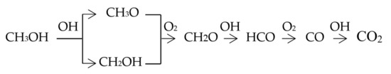 - Rasmussen, C.L.; Wassard, K.H.; Dam-Johansen, K.; Glarborg, P. Methanol Oxidation in a Flow Reactor: Implications for the Branching Ratio of the CH3OH+OH Reaction. Int. Chem. Kinet. 2010, 40, 423–441. [Google Scholar] [CrossRef]