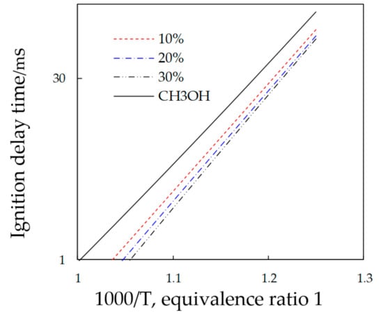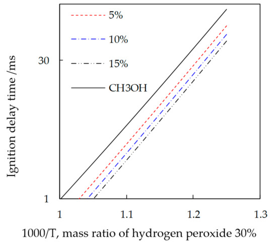 The combustion kinetics of methanol and hydrogen peroxide mixed fuel was analyzed. The chemical mechanism used here is a detailed chemical reaction mechanism of methanol combustion constructed by Li [19]. Li constructed a detailed chemical reaction mechanism for methanol combustion based on summarizing the mechanisms that appeared in the past, and Li has verified the mechanism by the way of experiments from low temperature to high temperature. The mechanisms that are comprehensive can predict methanol combustion in a wider range. The combustion process simulation was performed by using a closed homogeneous reactor model provided in the Chemkin-PRO program. Figure 6 was the effect of different hydrogen peroxide ratios on ignition delay when the equivalent ratio Φ = 1; the initial pressure is 3 MPa. It was obvious that, when the methanol fuel was added with hydrogen peroxide, its ignition delay was shorter than that of the pure methanol; the greater the proportion of the increase, the more favorable for the ignition.