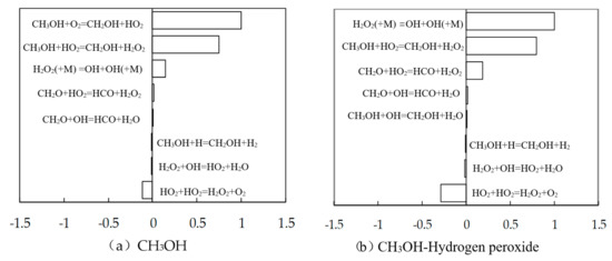 Figure 7 shows combustion analysis sensitivity of methanol and methanol–hydrogen peroxide hybrid fuel by using the closed homogenous reactor model provided in the Chemkin-PRO program (Version 4.5, Ansys Inc., Canonsburg, PA, USA). Here, the equivalent ratio is 1, initial temperature and pressure are respectively 800 K and 3 MPa, and the mixture contains 10% volume of hydrogen peroxide. The Figure 7 shows the eight elementary reactions with the largest temperature coefficients. As shown in the Figure, for pure methanol, sensitivity analysis shows that the elementary reaction with the maximum positive temperature sensitivity coefficient was CH3OH + O2 = CH2OH + HO2, and the second one is CH3OH + HO2 = CH2OH + H2O2. Here, positive temperature sensitivity coefficient means that the elementary reaction promotes the temperature increase, and promotes the combustion. After the addition of hydrogen peroxide, the elementary reaction with the maximum positive temperature sensitivity coefficient was H2O2 (+M) = OH + OH (+M). The reaction of CH3OH + O2 = CH2OH + HO2 has no significant effect on temperature. It could be seen that H2O2 produces OH through reaction H2O2 (+M) = OH + OH (+M). The addition of hydrogen peroxide directly added the active radical OH into the whole reaction, shortening the chemical reaction chain and accelerating the combustion.