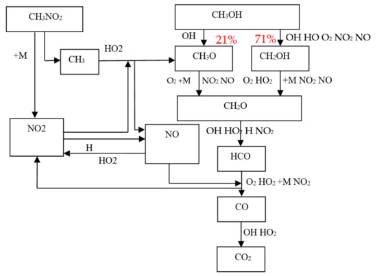 In order to further analyze the effect mechanism of the nitromethane on the combustion of methanol, the reaction path of the main components of methanol and nitromethane mixed fuel combustion was analyzed, which was shown as Figure 9. Figure 9 shows that the main reactions of methanol are as follows: CH3OH is consumed primarily by dehydrogenation reactions with hydrogen–oxygen free radicals and oxygen, as well as NOX. Among them, the most methanol is consumed in the reaction with OH. There is about 42% methanol consumed in the reaction of CH3OH + OH = CH2OH + H2O, 29% methanol was consumed in the reaction of CH3OH + OH = CH3O + H2O, and 19% methanol is consumed in the reaction of CH3OH + HO2 = CH2OH + H2O2. The above three reactions are the most important consumption routes for methanol. The rate of low temperature starting reaction of methanol (CH3OH + O2 = CH2OH + HO2) is very low, which consumed about 3% methanol. The dehydrogenation reaction between methanol and NOX consumes less than 10% of methanol.