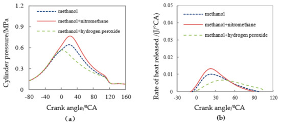 (a) Effect of nitromethane on the cylinder pressure; (b) Effect of nitromethane on the rate of heat release.