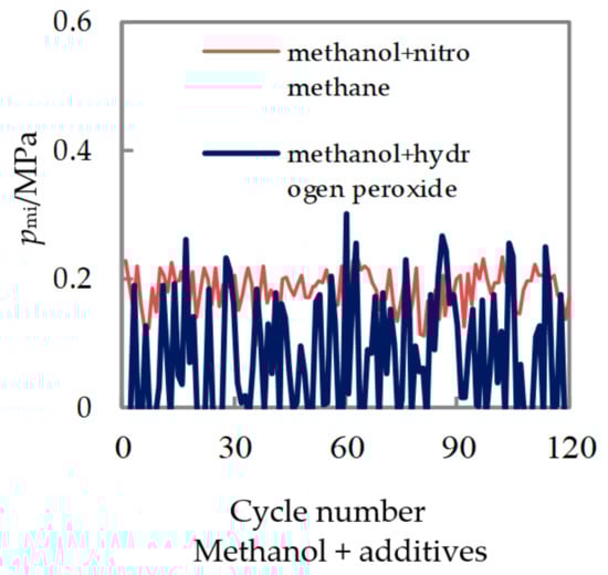 When two kinds of mixed fuels are used, the change in the mean indicated pressure Pmi of the 120 continuous test cycles was shown in Figure 11. It can be seen from the Figure that, compared with the no nitromethane fuel, after adding nitromethane, the range of Pmi value tends to concentrate and the number of misfire cycles decreases.