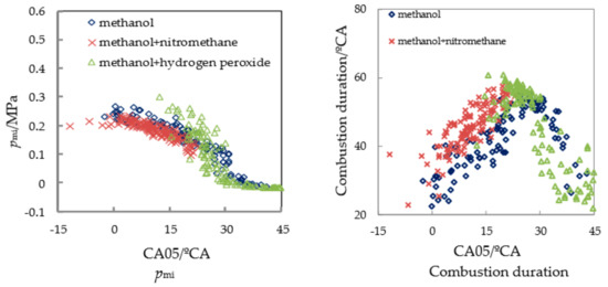 Figure 12 shows the correlation among the mean indicated pressure Pmi, the duration of combustion, and the starting point of combustion CA05 when methanol and two mixed fuels are burned. As pure methanol, the change range of CA05 was large, which was more than 40 °CA. The ignition time was relatively delayed, and there are more cycles in which CA05 appears after 25 °CA ATDC, resulting in a serious misfire, Pmi decreased rapidly. After adding the nitromethane additive, the range of CA05 variation was narrowed and CA05 concentrated between 0 °CA ATDC and 20 °CA ATDC, resulting in a lower misfire rate and enhanced combustion stability. CA05 showed an early trend, with a significant reduction in the number of cycles in which CA05 appears after 25 °CA ATDC. After the hydrogen peroxide solution was added, the ignition time was severely delayed, and the number of cycles in which CA05 appears after 30 °CA ATDC increased rapidly, resulting in a serious misfire.