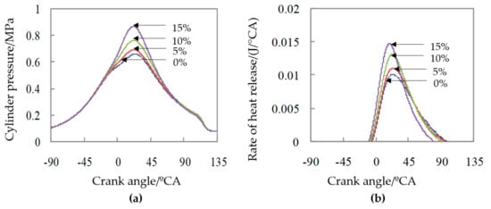 (a) Variations of cylinder pressure with different additives; (b) variations of the rate of heat release with different additives.