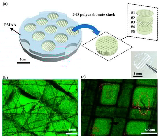 Although we visualized the trapped C. elegans by using the GFP (Figure 2b), the opacity of paper did not let much light pass through and did not provide high-resolution images in 3D. To enable direct and visual observation, we used paper-like transparent polycarbonate substrates for the culture system []. The system used the multi-laminate structure of the substrates to mimic the worm’s in vivo 3D environment. Since the substrate is thin, mechanically strong, and largely porous, the system is the same as our previous one with paper (in Section 2.1) but is transparent to facilitate visualization of the worms under a microscope (Figure S1). The system was constructed by stacking five polycarbonate layers patterned with cuts. Each layer had differently patterned cuts that were perpendicularly crossed over forming small square-shaped through-holes (~500 × 500 μm) at the intersections (Figure 4a). The worms could move vertically through the stack and horizontally along the grids during cultivation. The thick stack provided a 3D aquatic environment holding sufficient amount of LB media for the worms and E. coli. The stack was designed to have nine culturing wells (~1 cm diameter) with two PMMS supporting frames (Figure 4). The capillary wicking properties of porous polycarbonate substrates enabled controlled and uniform mass transport of nutrients and gasses for C. elegans while their optical transparency allowed real-time monitoring under the microscope without the GFP expression (Figure 4b,c). Moreover, this thin, cost-effective, and disposable polycarbonate substrate permits easy cleaning, sterilizing, and microfluidic pathways. Finally, the stack can be assembled in modular fashion, which allows us to control the thickness of the overall construct and diffusion of nutrients through the stack. Reversely, the simple de-stacking can promote easy C. elegans sampling for further experiments.