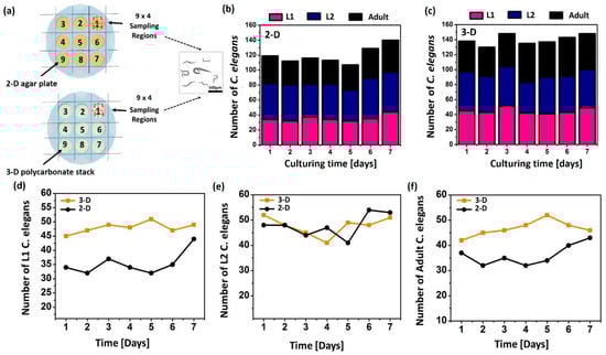 (a) Schematic illustration of experimental setup with two culture platforms. The number of C. elegans in L1, L2, and adult development stage (b) on the 2-D agar plate and (c) in the 3-D stack. Summary of the data with (d) L1, (e) L2, and (f) adult worms.
