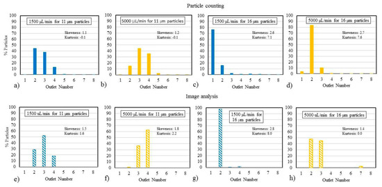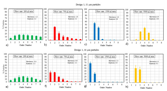 Design 1 was assessed over its full operating range at flow rates of 200, 750, 1500, and 5000 µL/min, which correspond to De values of 1.2, 4.4, 8.8, and 29.2, respectively. The focusing ability of the channel, which should directly correlate to separation efficiency, is demonstrated in Figure 3a–d for 11-µm particles and in Figure 3e–h for the 16-µm particles. The sum of all particles accounted for in the outlets adds up to 100% in each case.