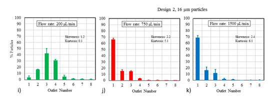 The effect of channel dimensions on the performance was also studied. Figure 3i–k displays the impact of channel size on particle focusing (n = 3) by using Design 2. At 1500 µL/min, both Designs 1 and 2 are effective at focusing 16-µm particles, as seen in Figure 3g,k. However, for lower flow rates, Design 2 exhibits better focusing behavior than Design 1, due to a higher confinement ratio (Table 1). The higher confinement ratio caused an increase in lift force on particles and concomitant focusing towards the inner wall. This is suggested by the higher kurtosis value for Design 2 of 6.4 at 1500 µL/min, compared to a kurtosis of 4.0 for Design 1. Therefore, a microchannel with a higher confinement ratio design is likely to be more effective at separating large particles such as CTCs at relatively low flow rates.