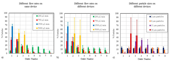 While most microfluidic chips used for point-of-care diagnostics or therapeutic applications are likely to be single-use disposables, some complex devices contain multiple-use microfluidic components. Thus, we investigated how single-use versus multiple-use scenarios affect particle focusing efficiency in triplicate (n = 3). First, we examined the agreement in test results obtained using the same test method on a single microfluidic chip (i.e., multiple uses of the same chip), and then, we assessed the overall variability when multiple chips are used for the same application (i.e., single uses of replicate chips). The coefficient of variation (% CV) was calculated for each test condition and used to assess the variability in the results. Figure 4a shows how reusability affects the focusing of 16-µm particles at different flow rates, and Figure 4b shows single-use chips tested at different flow rates for the same size particle. Reusing a single chip multiple times produced more consistent results (27% CV) than the chip-to-chip variability of 80% CV at the highest flow rate, but the consistency in reusing the same chip was worse than the 4–10% CV reported for other microfluidic applications [44]. For the 5000 µL/min condition in Figure 4b, the particles appear to focus somewhere between Outlets 2 and 3, creating a situation where subtle changes to the test system may direct most particles toward one outlet or the other, which explains the large error bars.