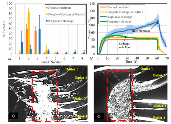 Figure 5b shows the pressure measurements made in the main channel of Design 1 under nominal conditions, as well as with different types of blockages. When Outlet 3 was completely blocked, the pressure in the circuit increased by about 10%. For a progressive blockage of an outlet, the pressure in the main channel increased above the nominal flow condition. As particles begin to accumulate, backpressure builds within the channel. The pressure in the main channel elevated up to 250% of the nominal pressure, which increased the likelihood of leakage at the inlet chip-to-tubing interconnection. An image of this type of blockage is shown in Figure 5c. Another interesting phenomenon observed in this study was the temporary blockage caused by particle accumulation and subsequent embolization. Particles can accumulate at the entrance to the outlet and create backpressure in the channel. An example of particle accumulation can be seen in Figure 5d, where particles accumulated at the entrance to the outlets, creating a partial blockage of flow spanning Outlets 2–4. Here, the pressure in the main channel built up within 10–20 s, as particles accumulated near the outlets (green line in Figure 5b). After the pressure increased to about 33% above the nominal condition, the particles embolized and were flushed through the outlets. After the occlusion embolized, the pressure gradually decreased until the nominal steady flow condition was reestablished.