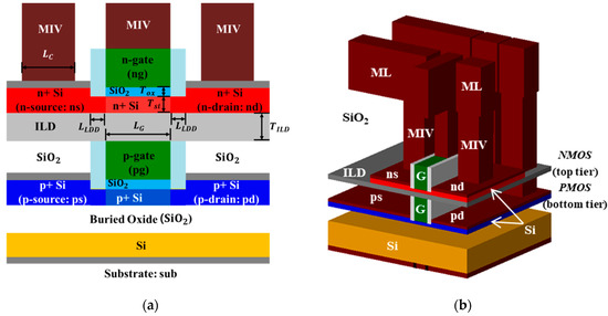 Figure 1 shows the schematics of an M3DINV composed of JLFET (M3DINV-JLFET). As shown in Figure 1a, an M3DINV-JLFET consists of n-type and p-type JLFET transistors in the top and bottom tiers, respectively. The doping of the JLFET’s source/drain, lightly-doped drain (LDD), and the channel are 1020, 1020, and 1019 cm−3, respectively. The JLFET was simulated at the gate length (Lg), gate oxide film (Tox), silicon thickness (Tsi), and ILD thickness (TILD) at 30, 1, 6 m, and 10 nm, respectively. The gate oxide, ILD, and box were composed of SiO2.