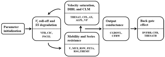 Figure 2 shows the Simulation Program with Integrated Circuit Emphasis (SPICE) model parameter extraction process used in this study. Through the process flow, model parameters were extracted by comparing them with the reference data. First, parameter initialization was performed, and the threshold voltage (Vt) roll-off and subthreshold swing (SS) degradation parameters were extracted. Next, the mobility and series resistance parameters, velocity saturation, drain-induced barrier lowering (DIBL), and channel length modulation (CLM) parameters were extracted. The process was repeated until the parameters were completely extracted. When the DC parameter extraction was complete, the output conductance parameters were extracted. Finally, the back gate effect parameters were extracted.