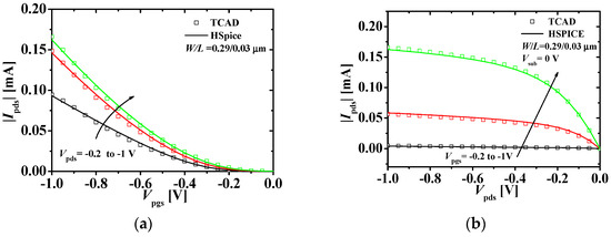Figure 3 shows the current-voltage characteristics with the TCAD and HSPICE simulation results of the bottom p-type JLFET. Based on the driving voltage of the inverter, the gate voltage and the drain voltage were verified up to 1 V. Figure 3a shows the drain current-gate voltage (IpdsVpgs) characteristics at Vpds (−0.2, −0.6, and −1 V) and Vsub = 0 V. Figure 3b shows the IpdsVpds characteristics at Vpgs (−0.2, −0.6, and −1 V) and Vsub = 0 V. The HSPICE results match the TCAD results within 10% error.