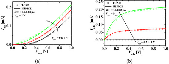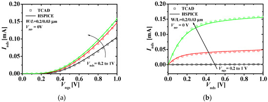 Figure 4 shows the current-voltage characteristics with the TCAD and HSPICE simulation results of the top n-type JLFET. Figure 4a shows the drain current–gate voltage (IndsVngs) characteristics at Vnds (0.2, 0.6, and 1 V) and Vpgs = 0 V. Figure 4b shows the IndsVnds characteristics at Vngs (0.2, 0.6, and 1 V) and Vpgs = 0 V. The HSPICE results match the TCAD results within 10% error.