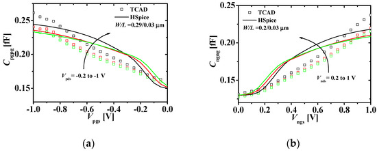 Figure 7. (a) Gate capacitance (Cpgpg) of the bottom p-type JLFET at different values of Vpdss; (b) gate capacitance (Cngng) of the top n-type JLFET at different values of Vnds s and Vpgs s = 0 V (symbols and lines denote the TCAD and HSPICE simulation results, respectively).
