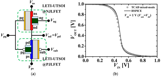 Figure 8. (a) Equivalent circuit of M3DINV-JLFET; (b) VTC of M3DINV-JLFET; VSS = 0 V and VDD = 1 V (the symbols and lines denote the TCAD mixed-mode and HSPICE simulation results, respectively; VIN = Vpg = Vng, VOUT = Vpd = Vnd, and Vsub = VDD).