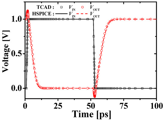 Figure 9 shows the transient response of the M3DINV-JLFET. Black squares (and solid lines) and red circles (and dot lines) denote the input voltages VIN and the output voltages VOUT of the M3DINV, respectively. Load capacitance CL = 1 fF was used. The HSPICE simulation results match the TCAD results overall within 10% error.