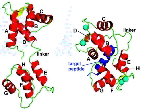Three-dimensional (3D) structure of apo-CaM (PDB code 1CFD (3), (left)) and an example of a canonical Ca4 3 CaM 3 target complex (PDB code 1CM1 (18), (right)). CaM helices A–H are shown in red, and the target peptide is depicted in dark blue. Cyan-colored spheres represent calcium ions [].