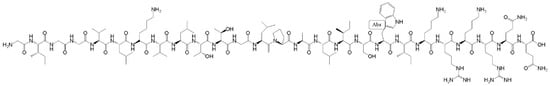Melittin (MEL) is known to be a significant peptide in bee venom; its structure is shown in Figure 2. Melittin consists of 26 amino acids and exhibits many excellent biological activities, such as antibacterial, antiviral, and anticancer functions []. Through in-depth mechanistic research, it was found that melittin could interact with various proteins, such as protein kinases [] and phospholipases []. Melittin has been reported to participate in the regulation of multiple biological reactions by altering the activity of proteins and enzymes through interaction with these molecules and has also been shown to exhibit or activate various biological activities.
