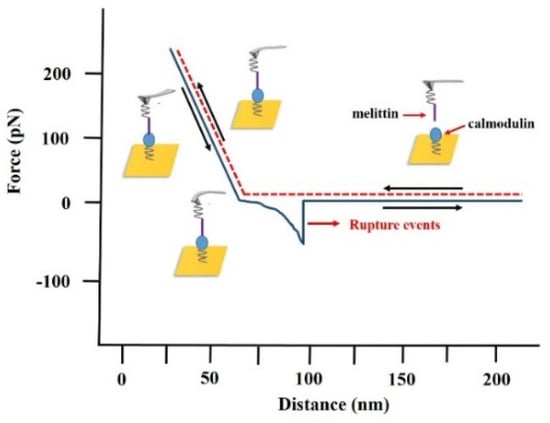 Example of the force–distance curve between melittin and calmodulin measured by atomic force microscopy (AFM). The extending stage is shown in the red dash line (probe approaches to a gold substrate); the retracting stage is shown in the solid blue line (probe tip withdraws from the gold substrate). Corresponding rupture events between melittin and calmodulin monolayer is also presented.