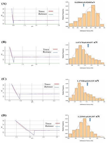 We also noted that during the actual process, the adhesion measured by AFM was not the interaction between single molecular melittin and calmodulin, but the result of the interaction between multiple melittin and calmodulin pairs. As such, we used the SAM method to modify the AFM tip. The tip had a certain radius of curvature, that is, there were more than a single melittin molecule on the tip and multiple calmodulin molecules on the substrate were therefore reflected in the adhesion value obtained by the AFM measurement. To resolve this, we applied the Poisson method [,] to analyze the unbinding force needed to separate a single pair of melittin and calmodulin.